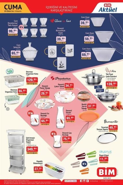 BİM 17 - 20 Ekim aktüel ürünler kataloğu yayımlandı. BİM'de bu hafta; küçük ev aletlerinden, beyaz eşyalara, ankastre setinden, kozmetik malzemelere, giyim seçeneklerinden mutfak eşyalarına birçok kategoride ürün indirimli fiyatlarıyla alıcılarını bekliyor. İşte BİM aktüel 17 - 20 Ekim 2023 kataloğu ve fiyat listesi...
