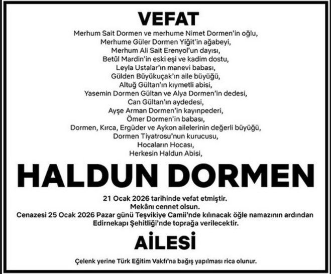 Sanatçının oğlu Ömer Dormen, paylaştığı vefat ilanında cenazeye çelenk gönderilmesinin yerine Türk Eğitim Vakfı'na bağış yapılmasını rica etti.