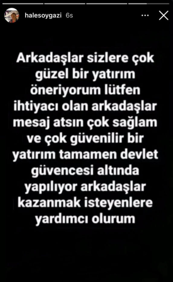 Dolandırıcılığa yönelik paylaşımlar yapılan hesaptan; "Arkadaşlar sizlere çok güzel bir yatırım öneriyorum, lütfen ihtiyacı olan arkadaşlar mesaj atsın. Çok sağlam ve çok güvenilir bir yatırım, tamamen devlet güvencesi altında yapılıyor. Arkadaşlar kazanmak isteyenlere yardımcı olurum" mesajları yayımlandı.