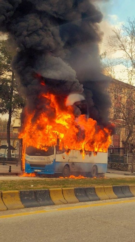Şehir içi halk otobüsünün alev alev yanma anları ise vatandaşların cep telefonu kamera kayıtlarına yansıdı.