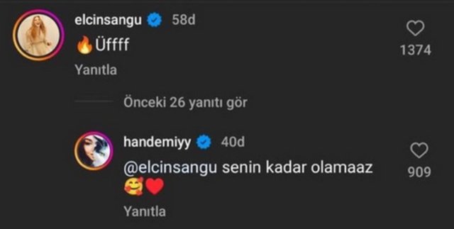 Elçin Sangu, Hande Erçel'in fotoğraflarına "Üffff" yorumunu yaptı, Hande Erçel ise, "Senin kadar olamaz" yanıtını verdi.