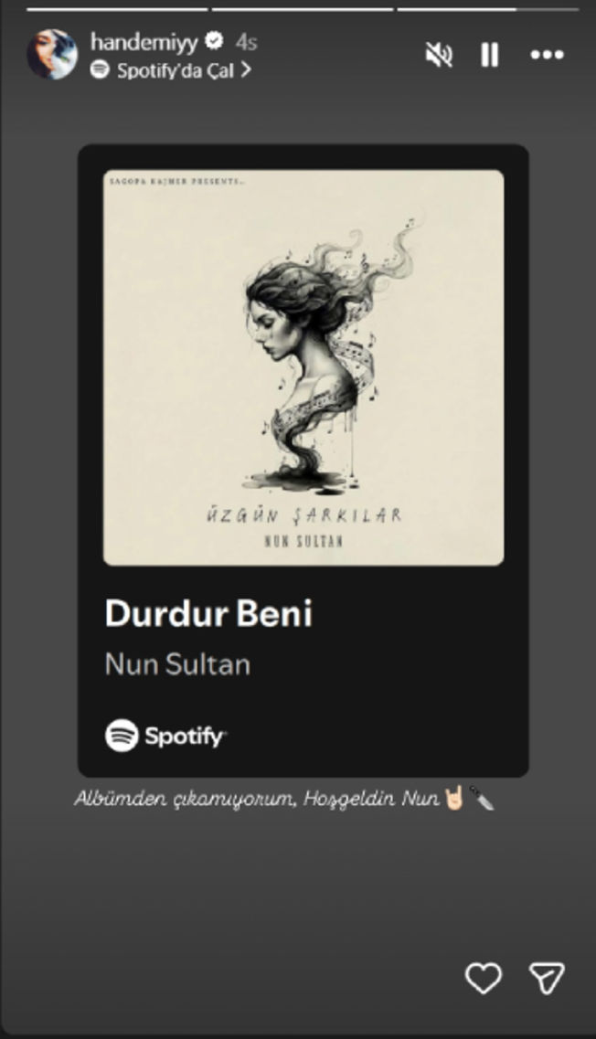 Hande Erçel’in bu açıklamasının ardından sosyal medya paylaşımı da dikkat çekti. Ünlü oyuncu, Instagram hikâyesinde Sagopa Kajmer’in yapay zekâ desteğiyle üretilen şarkılarında yer alan kadın vokal Nun Sultan'ın 'Durdur Beni' adlı şarkısını paylaştı.