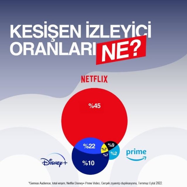 Gemius, Türkiye pazarında kesişen izleyici oranlarını da açıkladı. Temmuz ve Eylül 2022 aylarında ki verilere göre ziyaretçiler total erişimde en çok Netflix ve Prime’ı birbirleriyle paylaşmış. Disney Plus ve Netflix’i birlikte kullanan kullanıcı oranı ise yüzde 22 olarak verilmiş. Her üç platformu bir arada kullanan kişilerin oranı ise yüzde 7 değerinde.