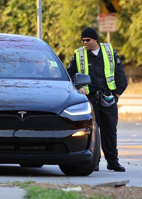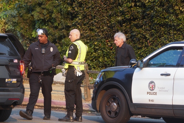 Harrison Ford, tahliye kararı verilen Sunset Bulvarı ve Mandeville Kanyon Yolu'nun kesiştiği yerde bulunan polis noktasına otomobiliyle geldi.