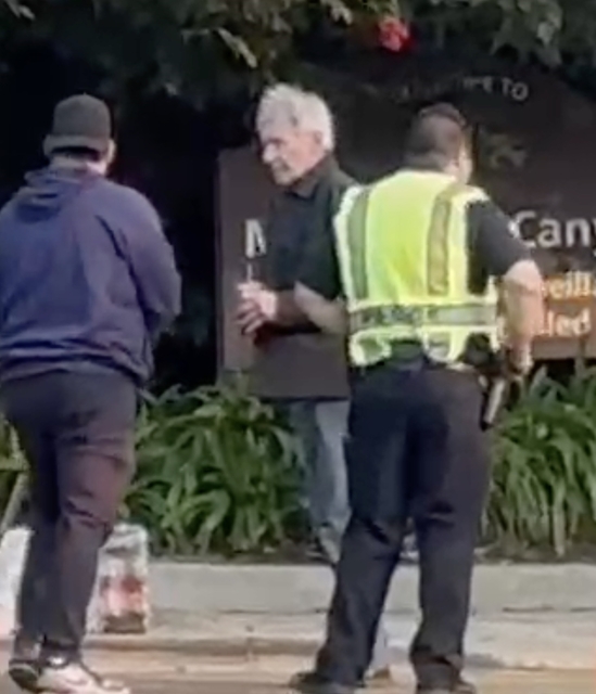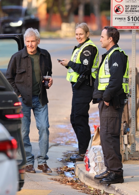 Tahliye edildikten sonra evini kontrol etmek isteyen Harrison Ford, otomobilinden inip polislerle konuşurken objektiflere yansıdı.