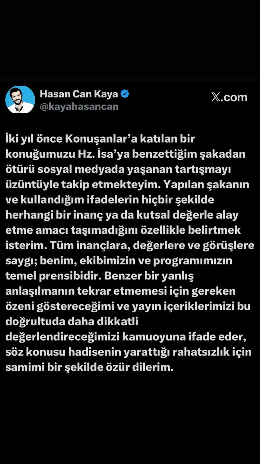 Hasan Can Kaya, açıklamasında;"İki yıl önce programa katılan bir konuğumuzu Hz. İsa'ya benzettiğim şakadan ötürü sosyal medyada yaşanan tartışmayı üzüntüyle takip etmekteyim. Yapılan şakanın ve kullandığım ifadelerin hiçbir şekilde herhangi bir inanç ya da kutsal değerle alay etme amacı taşımadığını özellikle belirtmek isterim. Tüm inançlara, değerlere ve görüşlere saygı; benim, ekibimizin ve programımızın temel prensibidir. Benzer bir yanlış anlaşılmanın tekrar etmemesi için gereken özeni göstereceğimi ve yayın içeriklerimizi bu doğrultuda daha dikkatli değerlendireceğimizi kamuoyuna ifade eder, söz konusu hadisenin yarattığı rahatsızlık için samimi bir şekilde özür dilerim" ifadelerini kullandı.