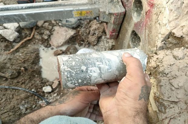 Kahramanmaraş merkezli depremlerin büyük yıkıma yol açtığı Hatay'da, kaldırılan enkazların ardından ölümlerin yaşandığı binaların zemininden karot ve demir örneği alma işlemleri devam ediyor. 15 dakikada alınması gereken numunenin yaklaşık 3 dakika içinde alındığı ve içinden deniz kumu karışımı çıktığı görüldü