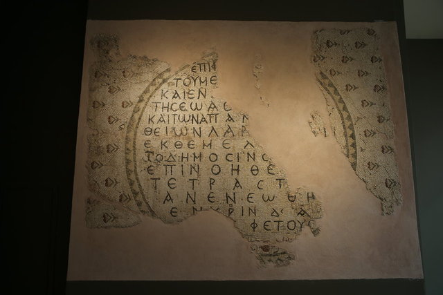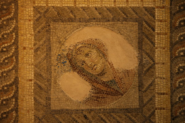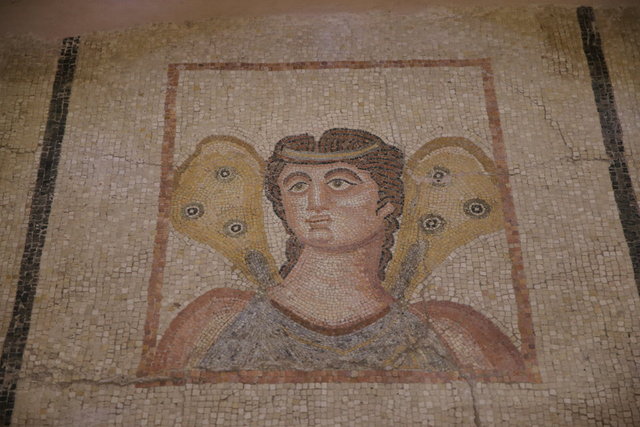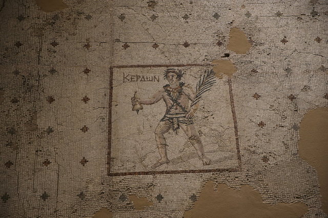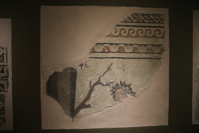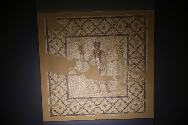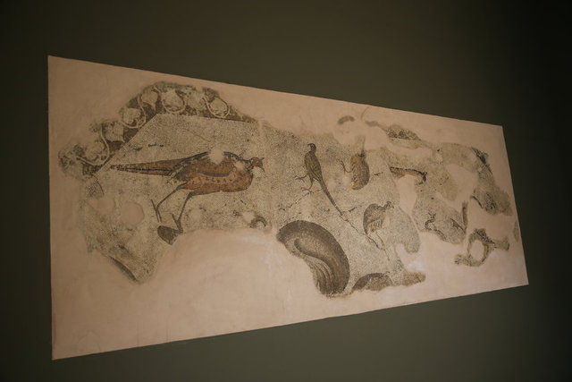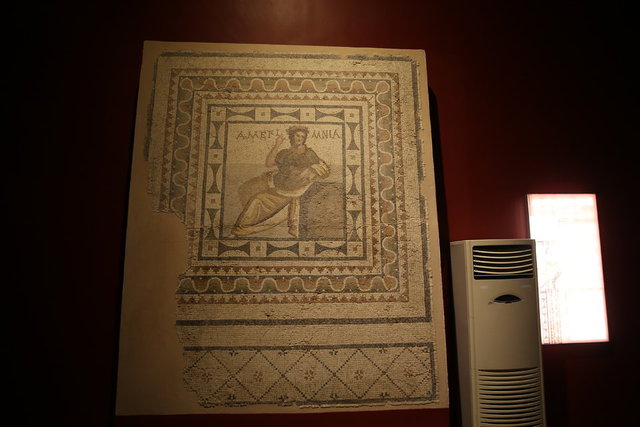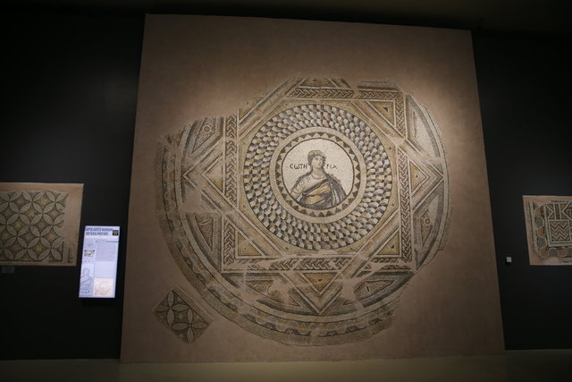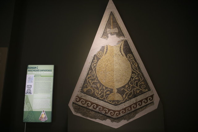 Müzede, kentte 1939'da bir kalıntıda gün yüzüne çıkarılan 'mavi göz bebeğine saldıran tırtıl, kuş, üç uçlu yaba, kılıç, akrep, yılan ve köpek' figürünün yer aldığı, üzerinde Yunanca 'Ve sen de' yazılı 'Senin de başına gelsin' anlamı taşıyan bedduanın bulunduğu mozaik dikkati çekiyor.