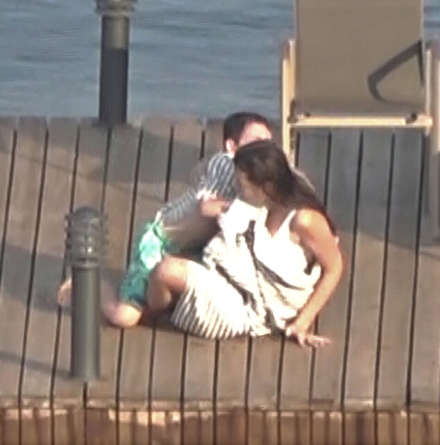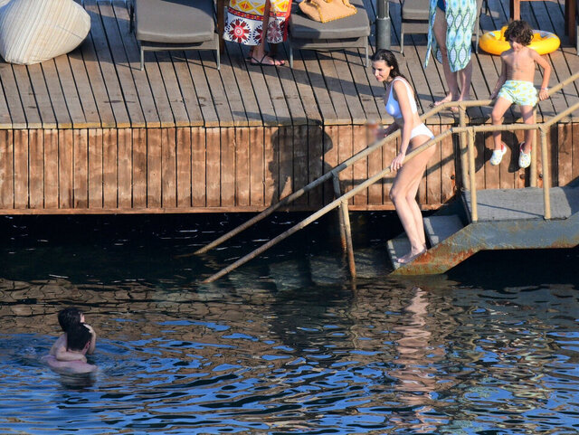 Ünlü çift, oğullarıyla birlikte Gündoğan'da konakladıkları otelin iskelesinde görüntülendi.