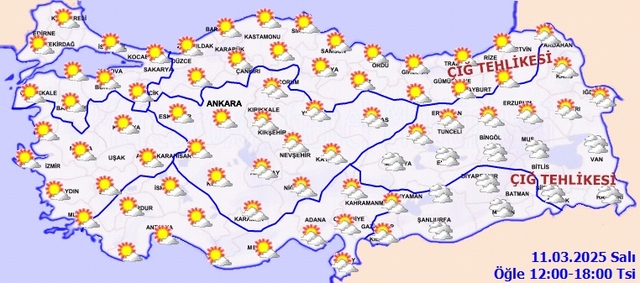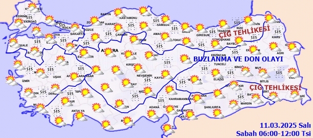 ÇIĞ TEHLİKESİ VE KAR ERİMELERİ İLE BUZLANMA VE DON OLAYI UYARISI: Gece ve sabah saatlerinde doğu bölgelerde buzlanma ve don olayı, Doğu Karadeniz'in iç kesimleri ile Doğu Anadolu'nun yüksek ve eğimli yamaçlarında çığ tehlikesi bulunduğundan heyelan, ulaşımda aksamalar ve kar erimesine bağlı olumsuzluklara karşı ilgililerin ve vatandaşlarımızın dikkatli ve tedbirli olmaları gerekmektedir.
