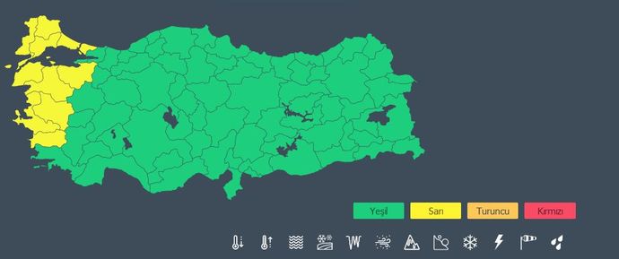 Yarın İstanbul, Tekirdağ, Kırklareli, Edirne, Çanakkale, Bursa, Balıkesir, İzmir, Aydın ve Manisa için "sarı" alarm verildi.
