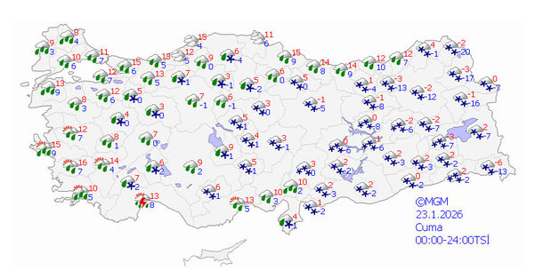 Kıyılarda yağmur ve sağanak yağışlı, batı bölgelerde yağmur ve karla karışık yağmur, yağış alan diğer yerlerde kar şeklinde görülecek olan yağışların; Marmara’nın batısı, Kıyı Ege, Hatay'da kuvvetli yağış, Antalya çevrelerinde çok kuvvetli ve şiddetli yağış, Güneydoğu Anadolu ile Sivas, Kayseri, Yozgat, Nevşehir, Elazığ, Tunceli, Bitlis, Bingöl, Malatya, Kahramanmaraş ve Osmaniye çevrelerinde kuvvetli kar yağışı olması bekleniyor.
