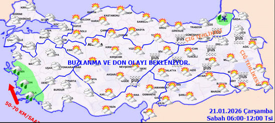 Gece ve sabah saatlerinde Marmara'nın doğusu ile iç ve doğu bölgelerde buzlanma ve don olayı ile birlikte pus ve yer yer sis bekleniyor. Doğu Karadeniz’in iç kesimlerinin yüksekleri ile Doğu Anadolu’nun doğusunda yüksek kar örtüsüne sahip eğimli kesimlerinde çığ tehlikesi bulunmaktadır.