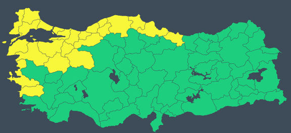 Meteoroloji tarafından 24 kent için "sarı" kodlu fırtına alarmı verildi. İşte o kentlerimiz: Aydın (Sağanak), İstanbul, İzmir, Bursa, Kocaeli, Balıkesir, Bilecik, Bolu, Çanakkale, Edirne, Eskişehir, Kastamonu, Kırklareli, Kütahya, Ordu, Sakarya, Samsun, Sinop, Tekirdağ, Zonguldak, Bartın, Yalova, Karabük ve Düzce (Fırtına).