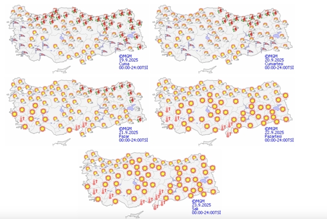 Meteoroloji Genel Müdürlüğü tarafından yapılan tahminlere göre: Ülkemizin kuzey kesimlerinin parçalı, yer yer çok bulutlu, Marmara'nın doğusu ve Karadeniz ile Doğu Anadolu'nun kuzeyinin aralıklı sağanak ve gök gürültülü sağanak yağışlı, diğer yerlerin parçalı ve az bulutlu geçeceği tahmin ediliyor. Yağışların Sakarya, Düzce, Zonguldak, Bartın illeri ile Kastamonu, Bolu ve Karabük'ün kuzey ilçelerinde yerel kuvvetli, zamanla Giresun ve Trabzon çevrelerinde kuvvetli, Giresun'un doğusu, Trabzon'un batı ve doğu ilçeleri ile Rize ve Artvin'in kuzeyinde çok kuvvetli olması bekleniyor.