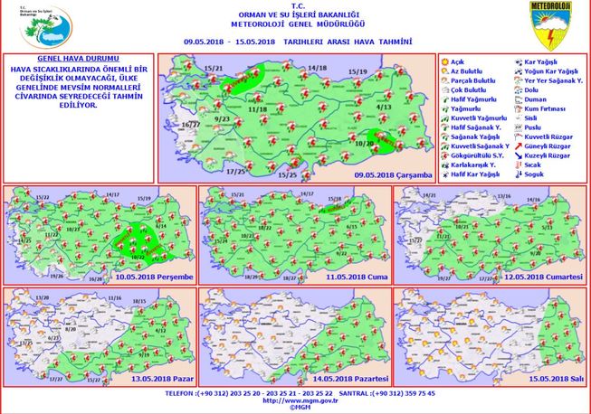 Ülkemiz genelinin parçalı ve çok bulutlu, Kıyı Ege ve Manisa dışında kalan tüm bölgelerimizin sağanak ve gök gürültülü sağanak yağışlı geçeceği tahmin ediliyor. Yağışların; Sakarya, Kocaeli, Bursa, Bilecik, Adana, Bolu, Düzce, Bartın, Zonguldak, Karabük, Kütahya, Afyonkarahisar, Eskişehir, Diyarbakır, Batman, Mardin, Siirt, Şırnak, Amasya, Hatay kıyıları, Samsun'un iç kesimleri, Çorum'un doğusu ve Tokat'ın batısında yerel olarak kuvvetli (21-50 Kg/m2) olması bekleniyor. Bu sabah saatlerinde Marmara'nın kuzeyi ile Karadeniz kıyı kesimlerinde yer yer sis ve pus olayı görüleceği tahmin ediliyor.