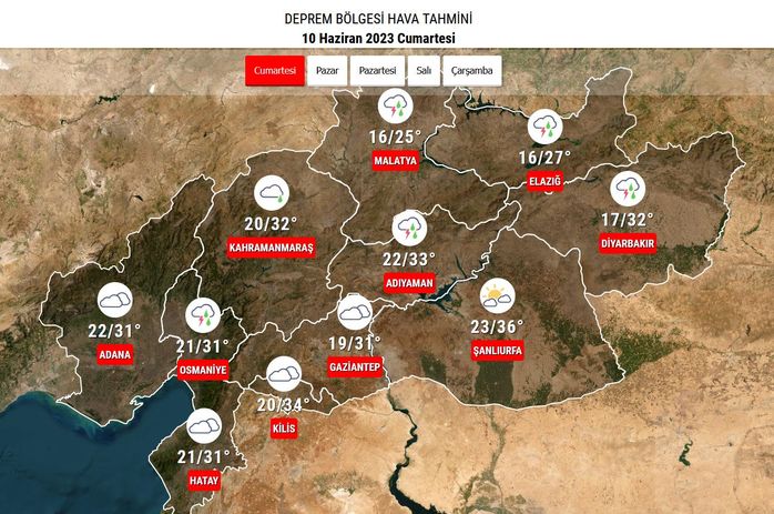 K.MARAŞ: 32, Parçalı ve çok bulutlu, öğle saatlerinden sonra yerel sağanak ve gök gürültülü sağanak yağışlı.