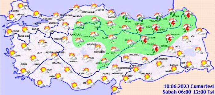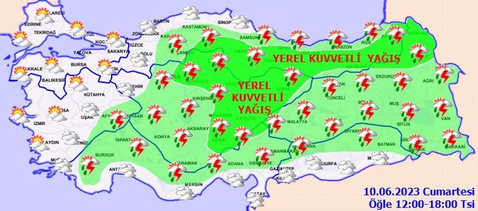 Yağışların; öğle saatlerinden sonra İç Anadolu’nun doğusu, Orta ve Doğu Karadeniz’in iç kesimleri, Çankırı, Kırıkkale, Ardahan ve Kars çevreleri ile Ankara'nın doğu ilçelerinde yerel kuvvetli olması bekleniyor.