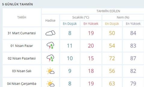 Parçalı ve çok bulutlu geçeceği tahmin ediliyor. Rüzgarın akşam saatlerinden sonra bölgenin doğusunda güneybatı yönlerden kuvvetli yer yer kısa süreli fırtına şeklinde esmesi bekleniyor. Rüzgarın akşam saatlerinden sonra Kıyı Ege ve Kuzey Ege'de güney yönlerden kuvvetli yer yer kısa süreli fırtına (40-70 Km/saat) şeklinde esmesi bekleniyor.
