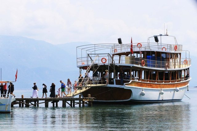 Sedir Adası'nın ziyaretçileri hem denize giriyor hem tarihi yapıları geziyor
