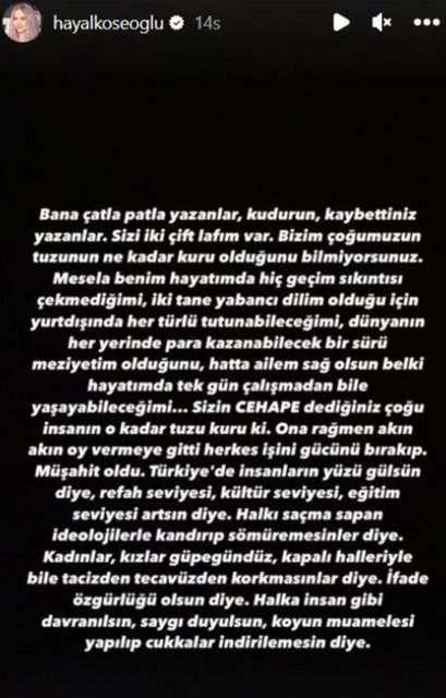 Hayal Köseoğlu seçim sonrası gelen mesajlar sebebiyle yaptığı paylaşımda: "Bana çatla patla yazanlar, kudurun, kaybettiniz yazanlar. Size iki çift lafım var; bizim çoğumuzun tuzunun ne kadar kuru olduğunu bilmiyorsunuz. Mesela benim hayatımda hiç geçim sıkıntısı çekmediğimi, iki tane yabancı dilim olduğu için yurt dışında her türlü tutunabileceğimi, dünyanın her yerinde para kazanabilecek bir türlü meziyetim olduğunu, hatta ailem sağ olsun belki hayatımda tek gün çalışmadan bile yaşayabileceğimi..." dedi.