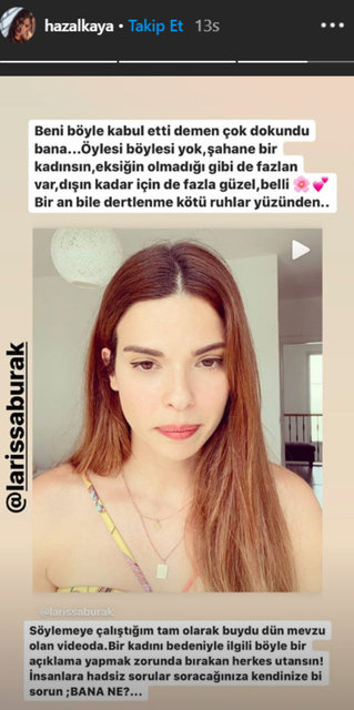 Oyuncu Hazal Kaya, "Çocuğum olmuyor. Burak beni böyle kabul etti. Allah beni böyle yaratmış" açıklamasını yapan Larissa Gacemer'e destek oldu. Kaya, "Beni böyle kabul etti' demen çok dokundu bana. Şahane bir kadınsın. Eksiğin olmadığı gibi fazla var. Bir kadını bedeniyle ilgili böyle bir açıklama yapmak zorunda bırakan herkes utansın" şeklinde konuştu