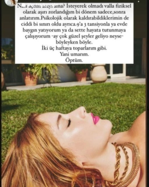 Konuyla alakalı açıklama yapan ünlü oyuncu, "Nasıl açtım arayı ama? İsteyerek olmadı vallahi... Fiziksel olarak aşırı zorlandığım bir dönem sadece, sonra anlatırım. Psikolojik olarak kaldırabildiklerimin de ciddi bir sınırı oldu. Ayrıca 9'a 3 tansiyonla ya evde baygın yatıyorum ya da sette hayatta tutunmaya çalışıyorum. Ay, çok güzel şeyler geliyor. Neyse... Böyleyken böyle. İki, üç haftaya toparlarım gibi; yani umarım! Öptüm..." şeklinde konuşmuştu.