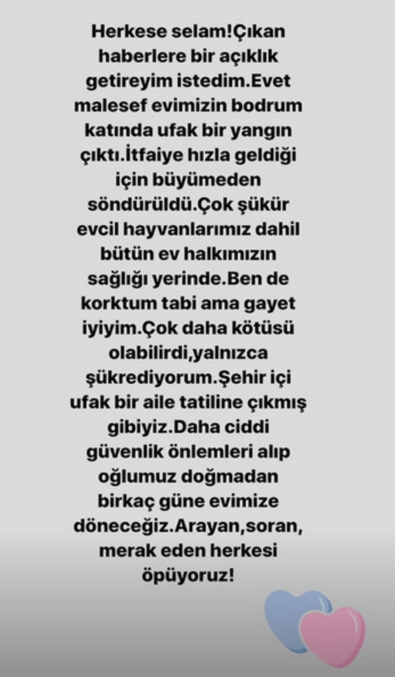 Herkese selam! Çıkan haberlere bir açıklık getireyim istedim. Evet maalesef evimizin bodrum katında ufak bir yangın çıktı. itfaiye hızla geldiği için büyümeden söndürüldü. Çok şükür evcil hayvanlarımız dahil bütün ev halkımızın sağlığı yerinde. Ben de korktum tabi ama gayet iyiyim. Çok daha kötüsü olabilirdi, yalnızca şükrediyorum. Şehir içi ufak bir aile tatiline çıkmış gibiyiz. Daha ciddi güvenlik önlemleri alıp oğlumuz doğmadan birkaç güne evimize döneceğiz. Arayan, soran, merak eden herkesi öpüyoruz!