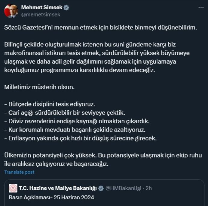 "Sözcü Gazetesi’ni memnun etmek için bisiklete binmeyi düşünebilirim. Bilinçli şekilde oluşturulmak istenen bu suni gündeme karşı biz makrofinansal istikrarı tesis etmek, sürdürülebilir yüksek büyümeye ulaşmak ve daha adil gelir dağılımını sağlamak için uygulamaya koyduğumuz programımıza kararlılıkla devam edeceğiz. Milletimiz müsterih olsun. - Bütçede disiplini tesis ediyoruz. - Cari açığı sürdürülebilir bir seviyeye çektik. - Döviz rezervlerini endişe kaynağı olmaktan çıkardık. - Kur korumalı mevduatı başarılı şekilde azaltıyoruz. - Enflasyon yakında çok hızlı bir düşüş sürecine girecek. Ülkemizin potansiyeli çok yüksek. Bu potansiyele ulaşmak için ekip ruhu ile aralıksız çalışıyoruz ve başaracağız."