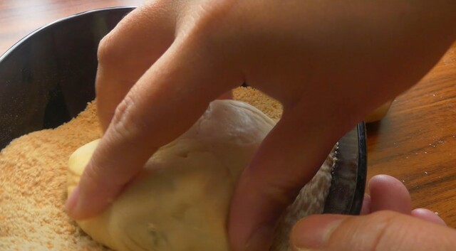 Bir kaba galeta unu dökün ve hamurunuzun tereyağı sürdüğünüz tarafını bu una batırın.