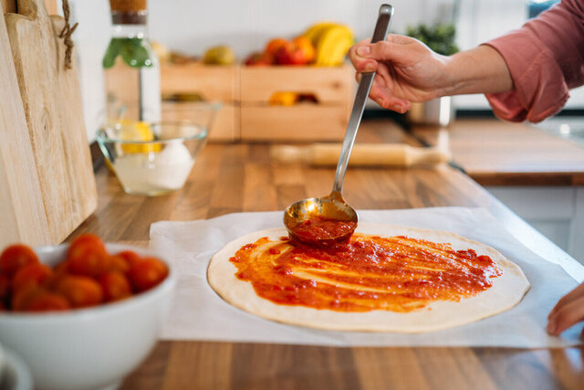 10 dakika sonra hafif pişen hamuru fırından çıkarıp, hazırladığınız domates sosundan üzerine sürün. Pizza sosunu, domates sosuna, fesleğen, kekik, sarımsak ve zeytinyağı ekleyerek hazırlayabilirsiniz.