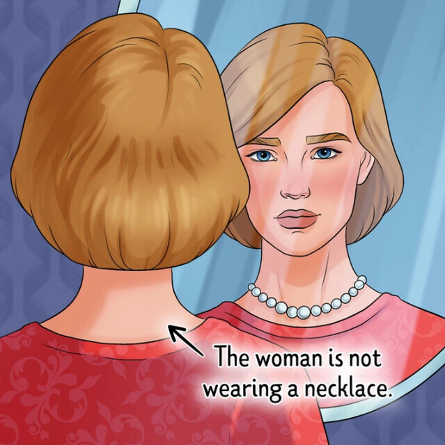 Cevap: Kadının aynadaki görünümünde kolye var ama boynunda yok.