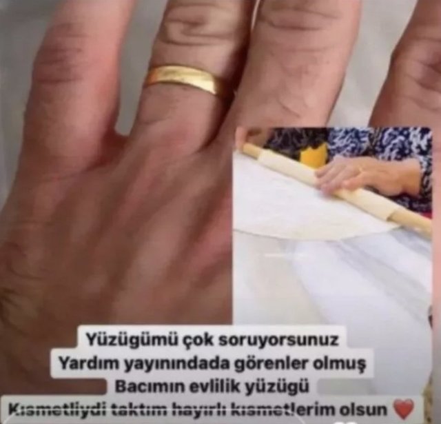 Alyansı dikkat çeken Ezildi, yaptığı paylaşım da şu ifadeleri kullandı: “Yüzüğümü çok soruyorsunuz. Yardım yayınında da görenler olmuş. Bacımın evlilik yüzüğü. Kısmetliydi taktım. Hayırlı kısmetlerim olsun.”