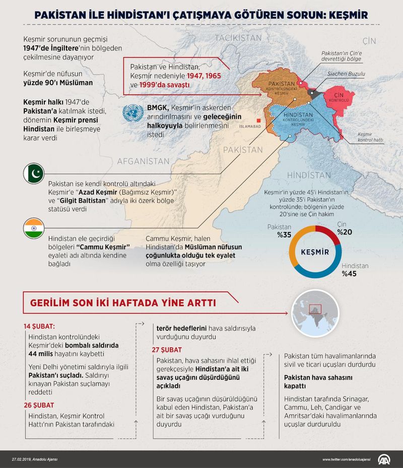 Pakistan ve Hindistan askerleri Keşmir Kontrol Hattı'nda karşılıklı ateş açtı. Hindistan ile Pakistan arasındaki son gerilim, Keşmir'in Hindistan idaresindeki kısmında 14 Şubat'ta polis teşkilatına bağlı milis gücüne yapılan ve 44 kişinin öldüğü bombalı saldırıyla başlamıştı
