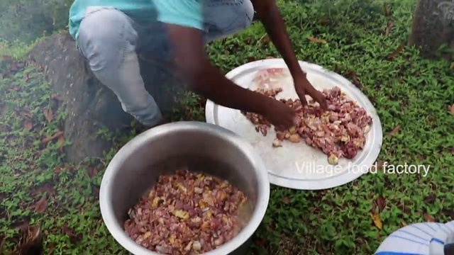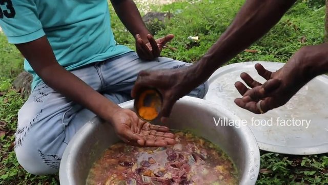 Temizlemek için eti su dolu tencereye boşalttı ikili... Ardından da etin tatlanması için köri ilave edildi.