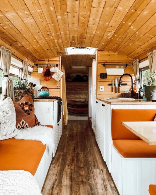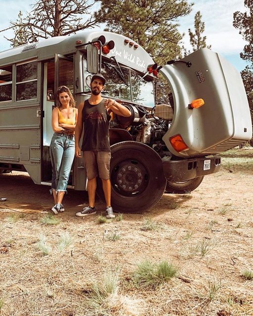Seyahat etmeyi çok seven fakat gezdikleri yerde konaklama ücreti ödemek istemeyen çift eski bir okul otobüsü satın alarak, kullanışlı bir karavana dönüştürdü.