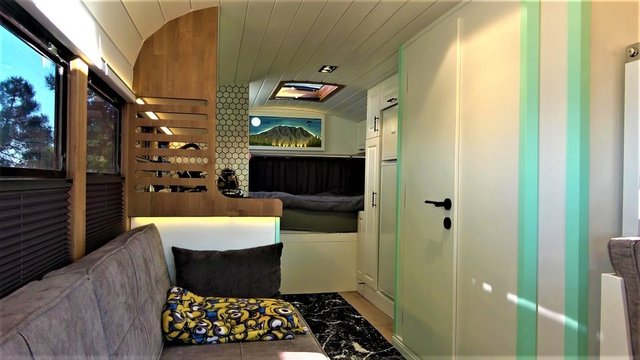 Araç, lüks bir yatak odası, yaşam alanı, mutfak ve banyoya sahip.