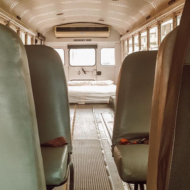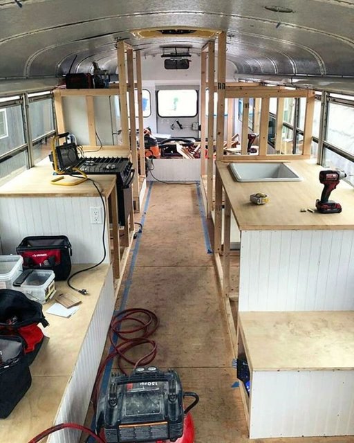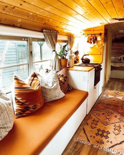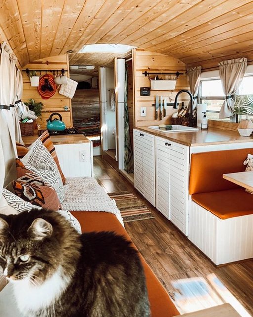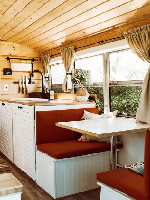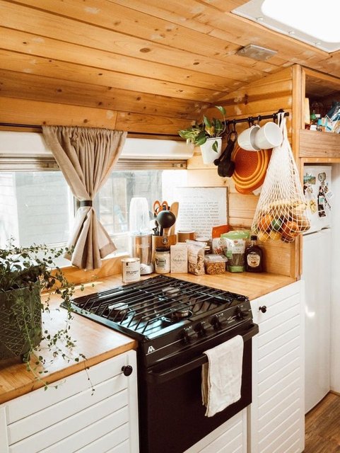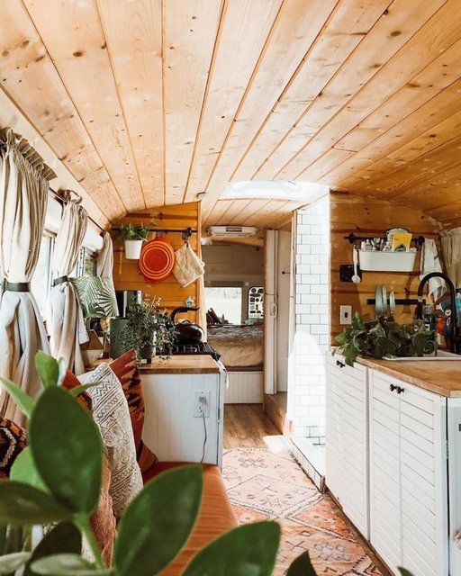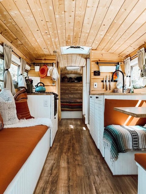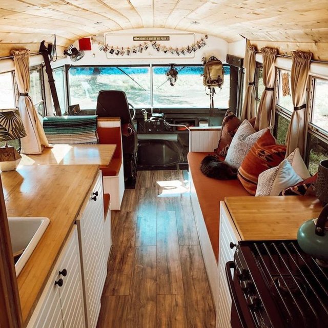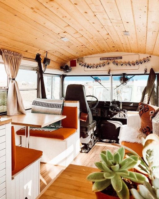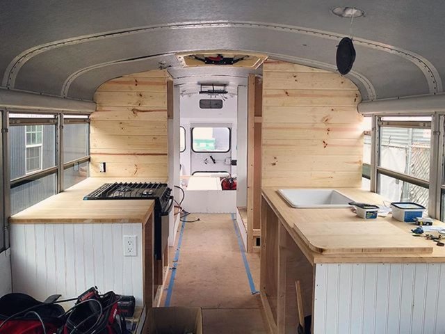 İkili, okul otobüsüne yatak, yemek masası, mutfak tezgahı, musluk, ocak, koltuk, ufak bir banyo, depolama alanları ve bolca bitki sığdırdı.