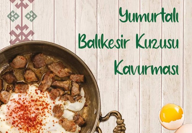 Yumurtalı Balıkesir kuzusu kavurması: Balıkesir'in meralarında dağ kekiği ile beslenen kuzulardan elde edilen Balıkesir kuzu eti Türkiye'nin ilk coğrafi işaretli işlenmemiş kırmızı eti olup diğer yörelerin kuzu etlerinden en büyük farkı, tadının ağır olmamasıdır. Lezzetlendirilmesi için baharata bile ihtiyaç duymayan bu et, kavrulduktan sonra yumurtayla birleşip kahvaltı sofrasında yerini alıyor.