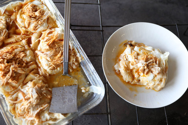 Düdüklü tencereye tavuk etlerini ve su ekleyip 20-25 dk pişirin. Genişçe bir tepsiyi tereyağı ile yağlayın. 1 adet yufkayı tepsiye serin ve üzerine erittiğimiz tereyağından sürün. Yufkanın tepsinin dışında kalan kısımlarını koparın ve diğer yufkalarıda parçalayarak tepsiye yerleştirin. Yufkaların aralarını ve üzerini tekrar yağlayın ve 180 derece fırında üzeri pembeleşene kadar pişirin. Haşlanmış tavukları didikleyin, üzerine tuz ve karabiber ekleyip harmanlayın. Beşamel sos için; derin bir tencereye süzme yoğurt , yumurta, sirke ekleyip çırpın sonra un koyup karıştırmaya devam edin. Tavuk suyuna sarımsağı ezerek ilave edin ve ılıştırarak sosa ekleyin kısık ateşte pişirin. Fırından çıkan yufkaları tavuk suyu ile ıslatın. Üzerine didiklediğiniz tavukları dağıtın. En son beşamel sosu da gezdirin, sıcak fırına tekrar verip üstü kızarana kadar pişirin. Fırından çıkan tepsinin üzerine Tereyağlı, tuz biberli karışımdan gezdirip servis yapabilirsiniz.