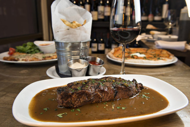 Ezilmiş karabiber ile kaplanan dana biftek, tavada yapılan sos ile servis edilir.