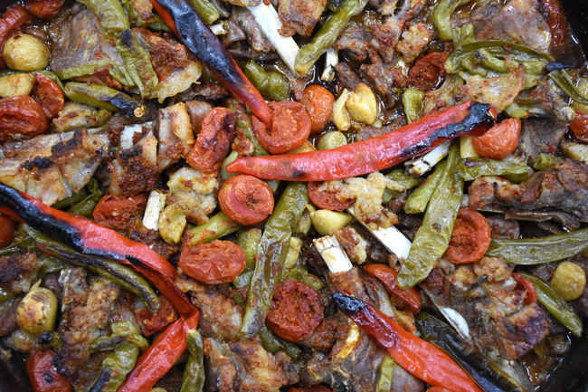 Bir gün sütte bekletilen, iki gün baharatlarla marine edilen zeytinyağında dinlendirilen kuzu eti, ardından kuyruk yağı, domates, biber ve sarımsakla buluşarak taş fırına girmek için hazır hale geliyor.