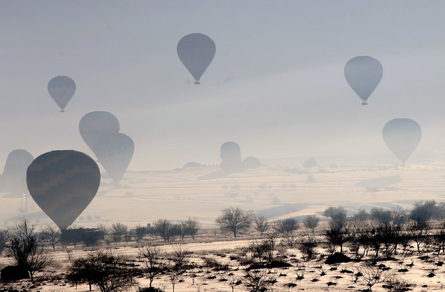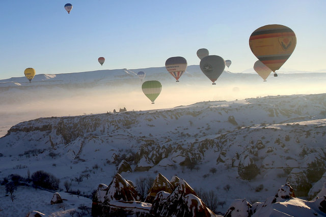 AA'nın haberine göre etkili olan karın ardından beyaza bürünen bölge eşsiz güzellik sergilerken, sıcak hava balonu turuna katılan ziyaretçiler peribacalarıyla kaplı vadiler üzerinde süzülerek manzarayı kuş bakışı izleme imkanı elde etti.