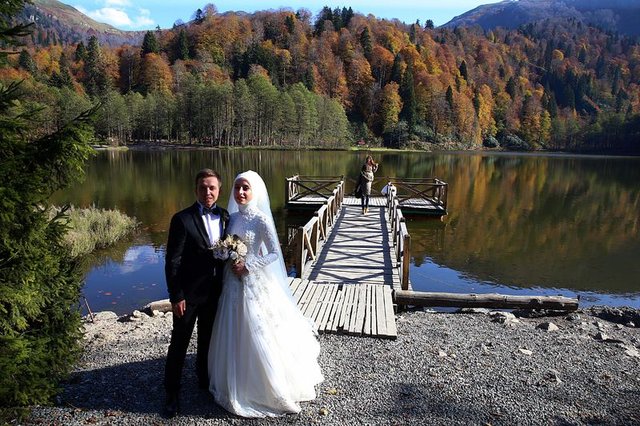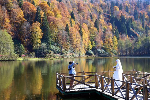 Evlenecek çiftlerin her mevsim tercih ettiği Karagöl, sonbahardaki farklı ortamıyla da vazgeçilmezliğini sürdürüyor. Artvin ve çevresindeki illerden düğün fotoğrafı çektirmek için gelen çok sayıda gelin ve damat, göl çevresinde farklı açı ve manzaralarda fotoğraf çektiriyor.