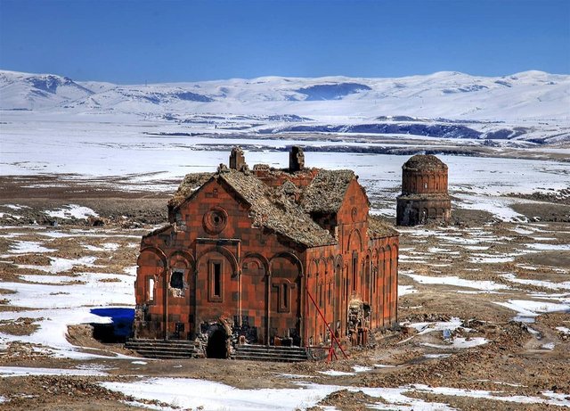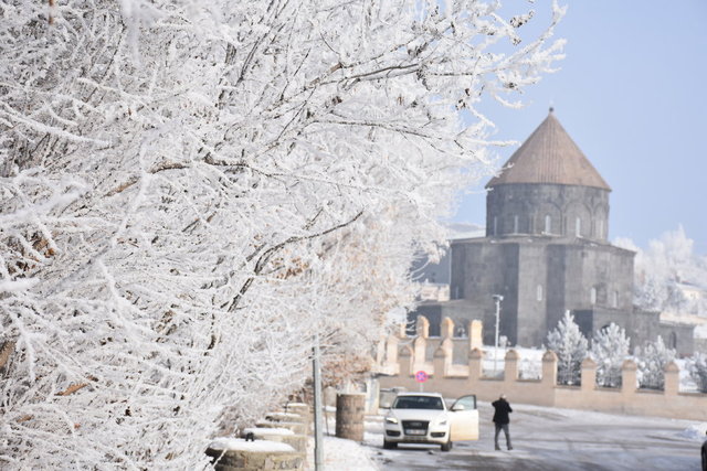 Kars-Ermenistan sınırında tarihi İpek Yolu üzerinde kurulu ve pek çok medeniyete ev sahipliği yapan Ani Ören Yeri, kışın kar altında beyaza bürünen görüntüsüyle ziyaretçilerine adeta görsel şölen sunuyor. Kış aylarında Kars'a gelen fotoğraf tutkunlarının dondurucu soğuğa rağmen ziyaret ettiği antik kentteki yapılar pek çok medeniyetin izlerini taşıyor. "Dünya Şehri" olarak da adlandırılan, 8 metre yüksekliğinde, 4 bin 500 metre uzunluğundaki surlarla çevrili antik kentteki en önemli yapılardan birisi de 1001 yılında yapımı tamamlanan Ani Katedral'i yada diğer ismiyle Büyük Katedral. Kırmızı, siyah ve kahverengimsi düzgün kesme taşlarla inşa edilen yapı bu gün hala bölgedeki en büyük yapı olarak dikkat çekiyor.