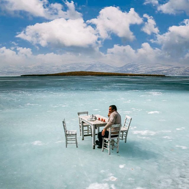 Yukarıdaki resim gözünüze ilk bakışta geçen yaz Bodrum Gümüşlük'te çekilmiş gibi görünebilir. Denize ayaklarını sokmuş masasında çay içmeye hazırlanan bir kişi. Ancak burası donmuş Çıldır Gölü. Doğu Anadolu'nun en büyük ikinci, Türkiye'nin ise önemli tatlı su göllerinden birisi.