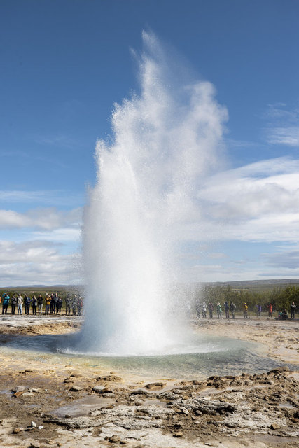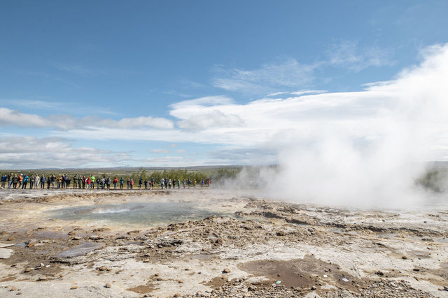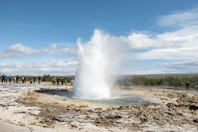Gullfoss'a oldukça yakın bir konumda bulunan Geysir'e gelen turistler basınçla havaya fışkıran sıcak suyu heyecanla izliyor.