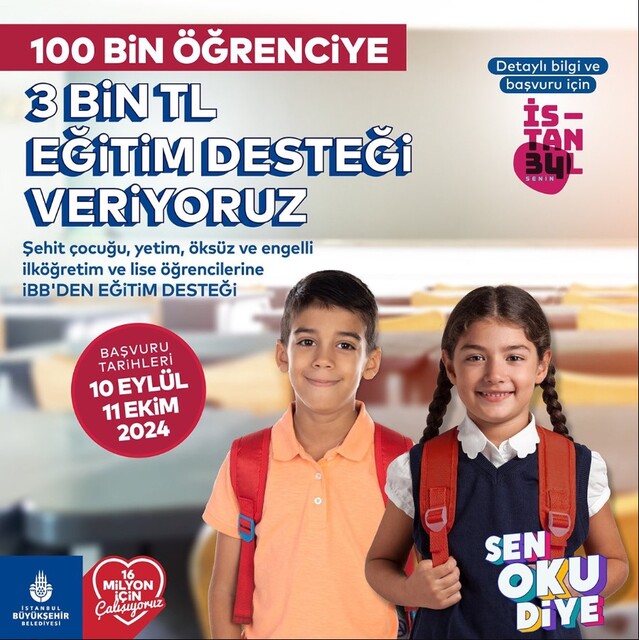 Şehit çocuğu, yetim, öksüz ve engelli öğrencilerin faydalanacağı 3 bin TL'lik eğitim desteğine İstanbul Senin uygulaması üzerinden başvurabilirsiniz.'' ifadelerini kullandı.