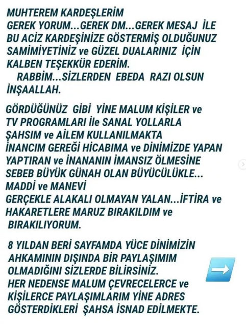 Buraya kadar ben yine sineye çekerdim AMA değil annem kim olursa olsun dini inanışlarından ötürü kendi hür idaresiyle seçtiği kıyafet üzerinden birinin aşağılanmasına göz yumamamam. Hiç kimse benim annemi kara peçeli diyerek aşağılayamaz. Hiç kimse benim anneme yılan diyemez. Benim annem kendi halinde, eşrafında herkesin saygı duyduğu eski bir devlet memuru ve namuslu bir kadındır. "Domuz yağı sürdüler, sevgilime büyü yaptılar, bizi ayırdılar" gibi ardı arkası kesilmez, korkunç, utanç verici iftiraları asla kabul etmiyorum ve milyonların önünde "büyü yaptılar, domuz yağı sürdüler" gibi açıklamalarıyla kendisinin akıl sağlığıyla ilgili olan şüphelerim artmıştır.
