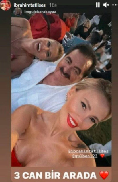 İbrahim Tatlıses, "Resmi değil, gönül evliliği yaptık" dediği sevgilisi Gülçin Karakaya ve yakın dostu Gülben Ergen ile kamera karşısına geçti. Tatlıses, birlikte verdikleri pozu, "Üç can bir arada" notuyla Instagram'dan paylaştı